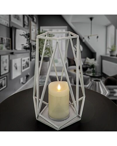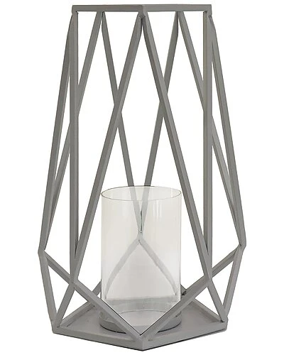 - This versatile indoor/outdoor lantern style candleholder is constructed of durable steel with a powder coated glacier gray color finish. The open geometric design will add a cool and contemporary touch to favorite gathering spaces. A clear glass chimney enclosure is included as an accent piece and to protect candle flame. For tabletop or floor display..Measures 9″L x 9″W x 12″H.Powder coated steel construction, glacier gray.Removable glass enclosure.Fits a single 3″ diameter pillar candle.For indoor or outdoor use