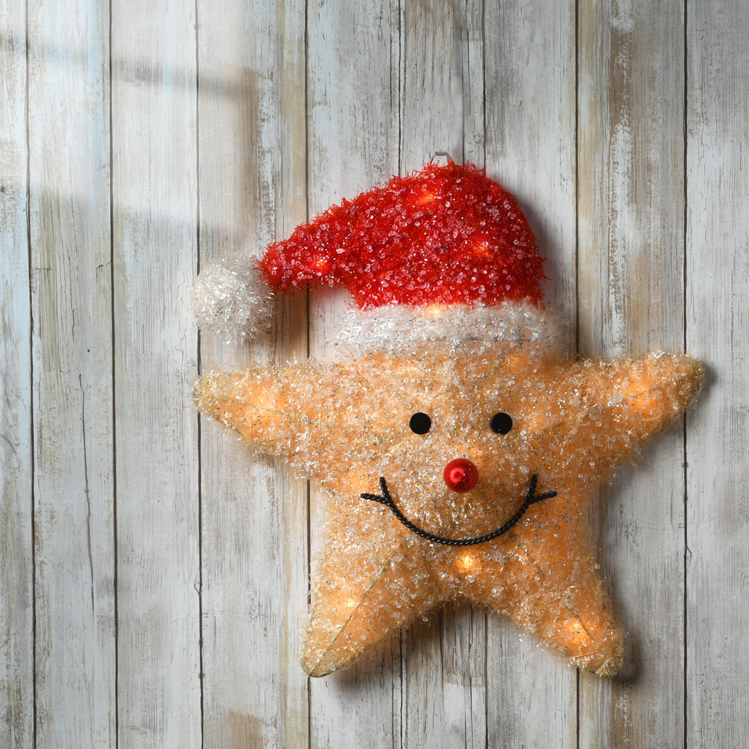 This pre-lit Smiling Star with Santa hat can be displayed in either indoor or covered outdoor locations. It is lit from inside with 20 warm white LED lights that create a soft glow. Battery operated with a convenient 6 hours ON/18 hours OFF timer. The combination of lights and tinsel material creates a decoration that sparkles and shines.