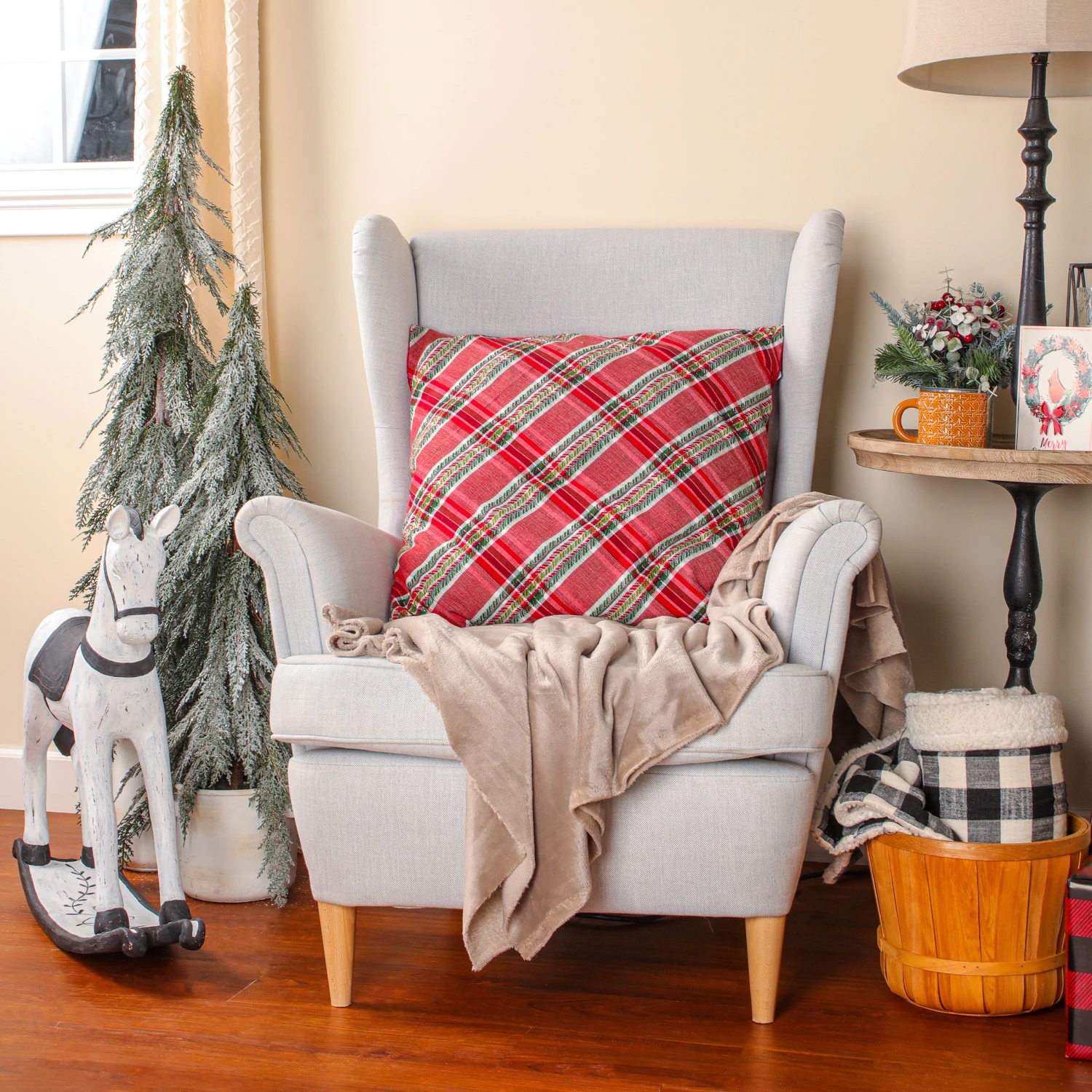 This Christmas red pillow features a bias-cut plaid design that is both festive and eye-catching. Smooth and soft, this furniture accent is made with a durable olefin outer shell and supportive polyester fill. Back side of pillow is solid red. Add a touch of inviting comfort to your holiday decorating scheme with this colorful cushion.