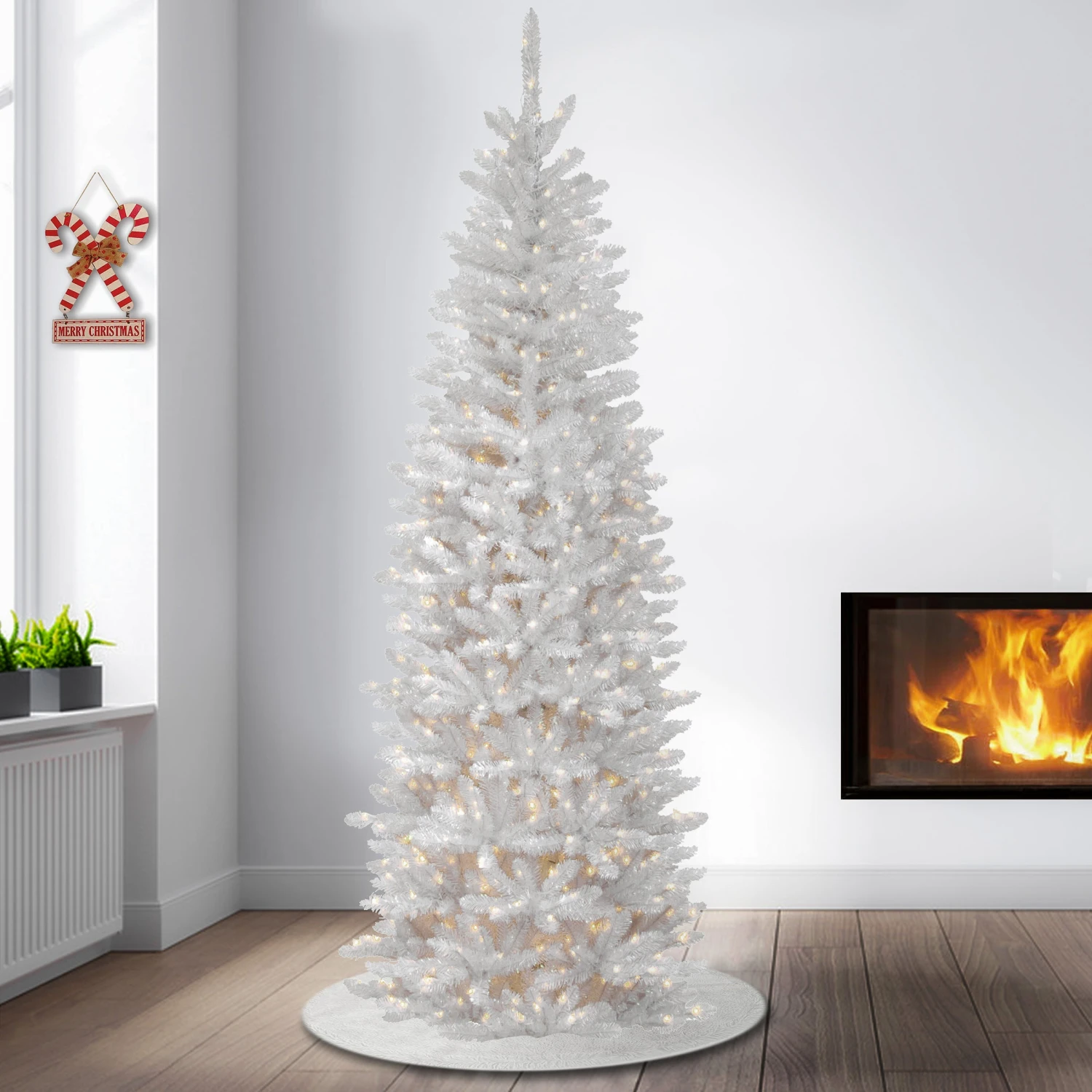 The Kingswood White Fir is an attractive alternative to the traditional green holiday tree. The pencil thin profile makes it a great choice for display in corners or limited space areas. It is pre-strung with 250 clear lights that remain lit even if a bulb burns out. This three section tree features hinged branches for ease of assembly. Sturdy folding metal tree stand is included.