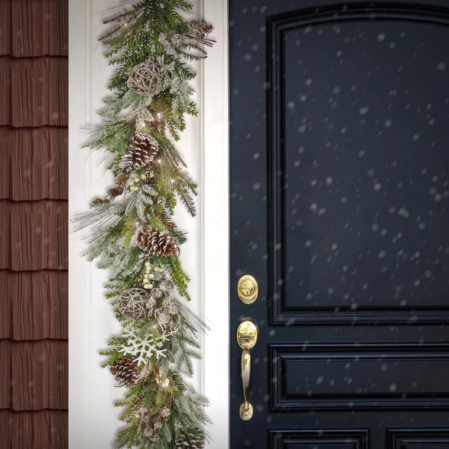 The Cozy Winter garland features a mixture of evergreen, bristle, and cedar branch tips trimmed with pinecones and berry clusters. It is decorated with glittered snowflakes and twig ball ornaments that add a festive flavor. It is pre-strung with 50 battery-operated warm white LED lights that are energy-efficient and long lasting. 6 hours ON/18 hours OFF timed operation. Display this garland over door, window, fireplace mantel, or stairway railing in indoor or covered outdoor locations.