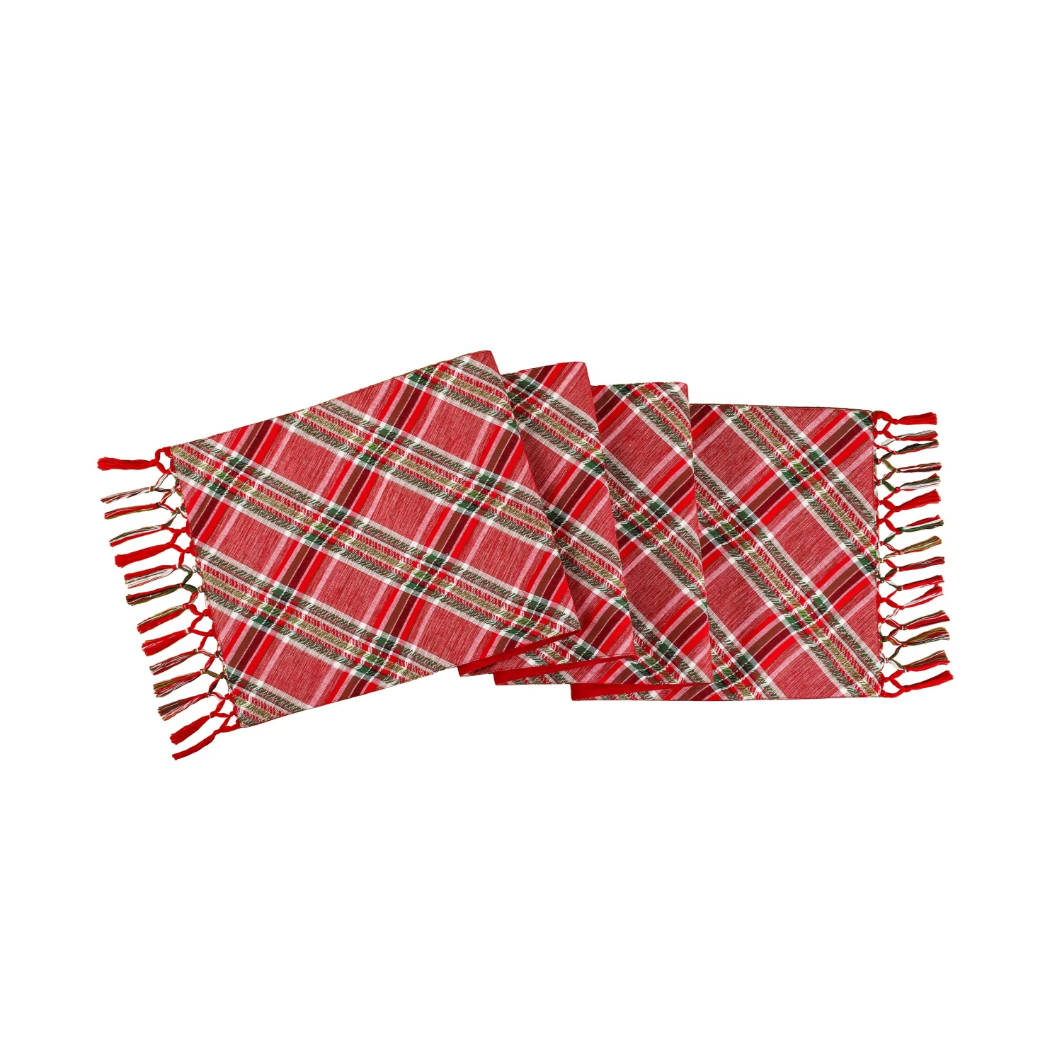 This Christmas red table runner features a bias-cut plaid design that is both festive and eye-catching. With vibrant reds and greens, this decorative runner will add a colorful flair to your holiday table setting. Long multicolor tassels fall from a looping edge design at both ends of the piece. This table runner is constructed of durable cotton materials fashioned for many years of holiday use.