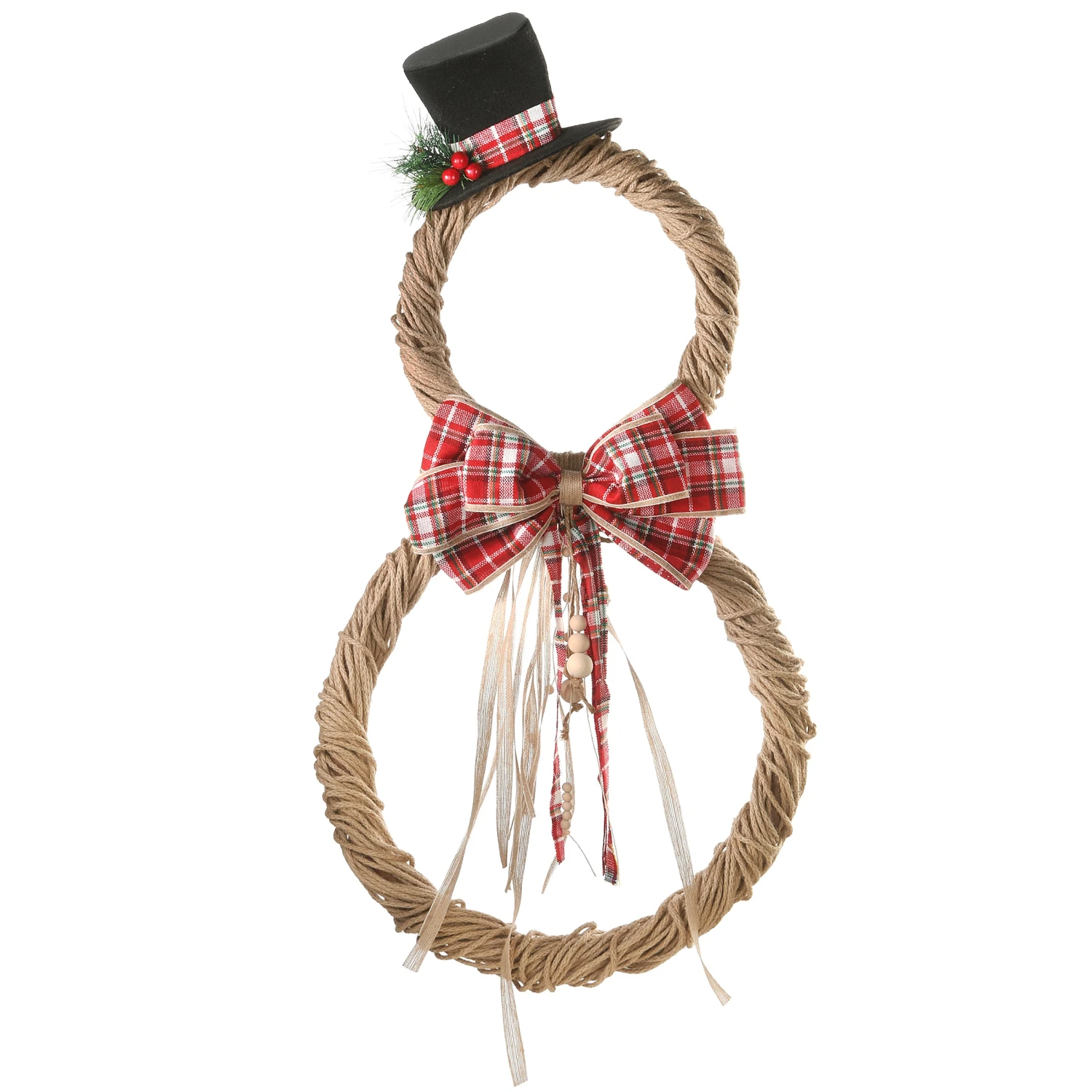 This holiday decoration features two rings in the shape of a snowman, wound thick with jute rope. At the center are multiple red and white plaid bows embellished with long ribbons and beaded cords adding a touch of flair. A black top hat with matching pla