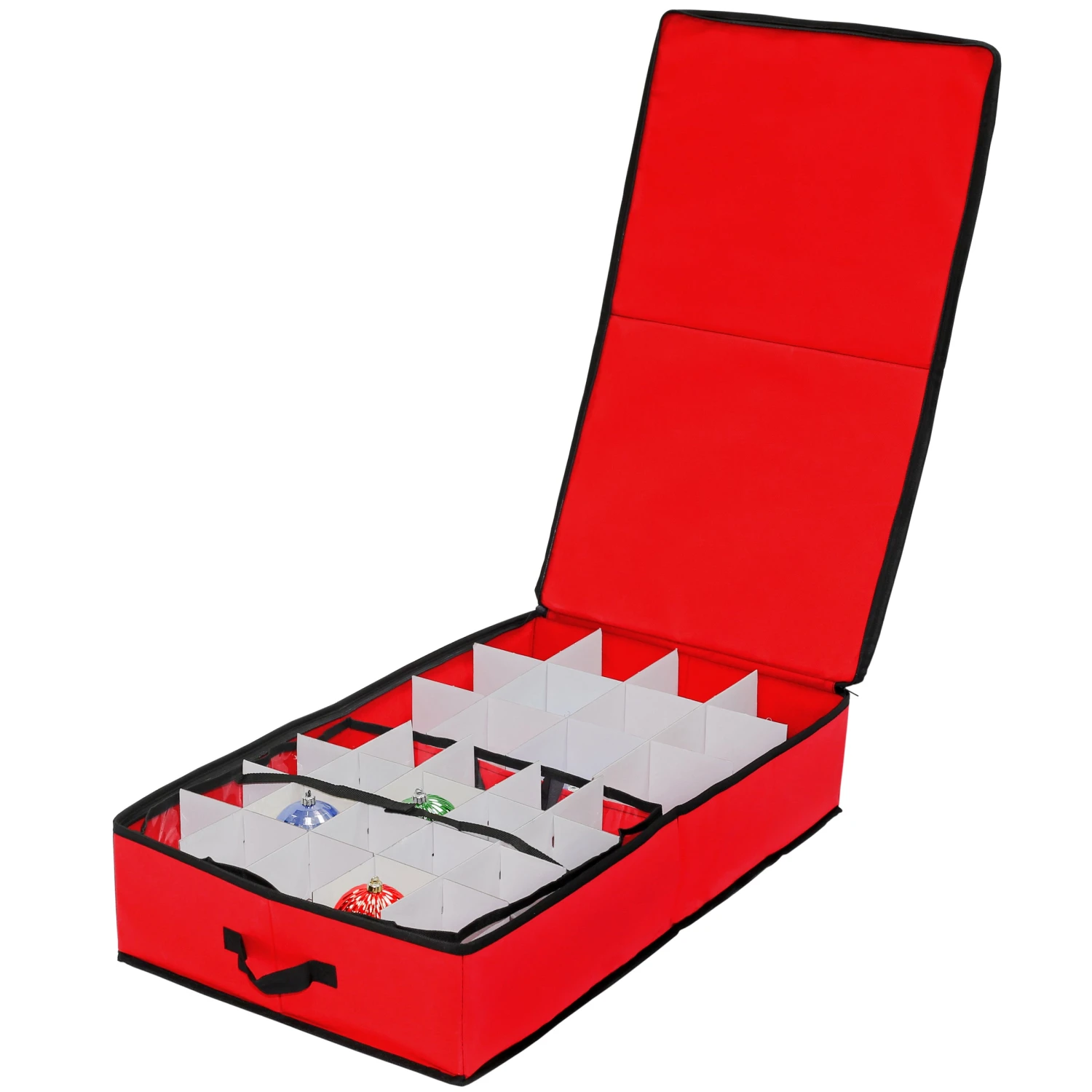 This efficient container provides safe and organized packing of ornaments for after holiday storage. It is constructed of durable stitched seam polyester material with zippered lid and convenient carry handles. The piece contains two removable cardboard dividers that allow for the storage of up to 52 ornaments.