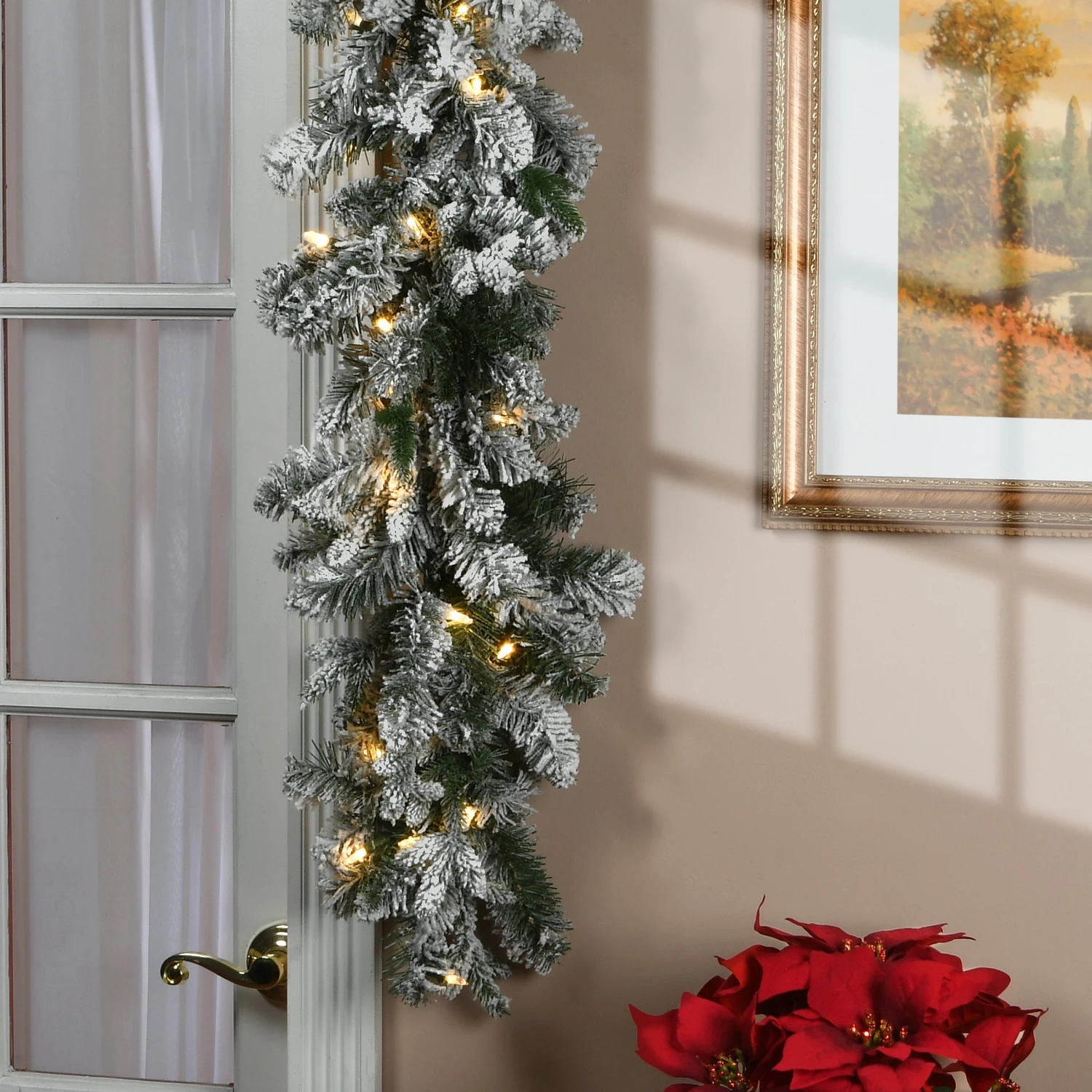 - Designed with a Snowy Green branch base, this pre-lit artificial Christmas garland is 9 feet long and decorated with pine cones and frosted branches.