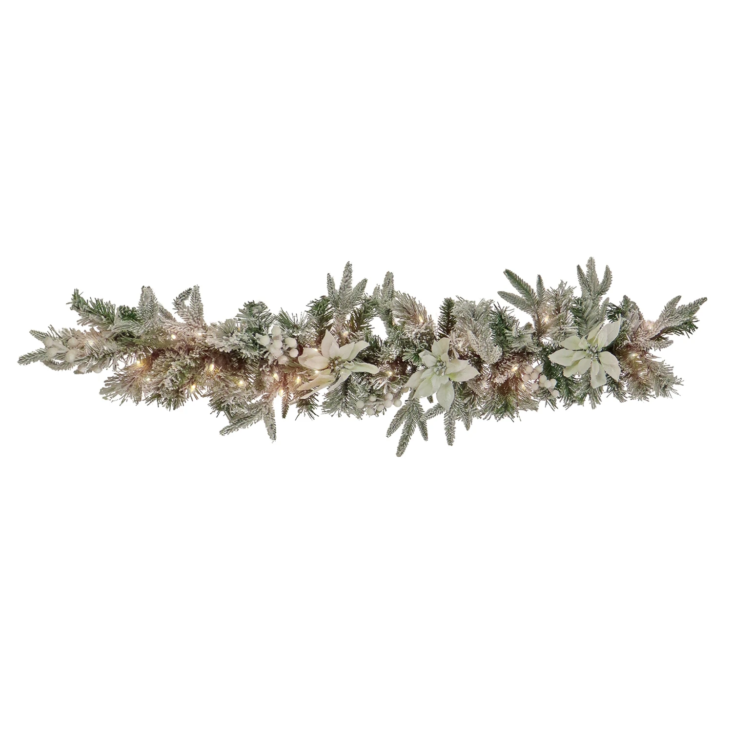 This Christmas garland features a blend of vibrant green branch tips giving a full bodied appearance and is decorated with white berry clusters, magnolia flower blooms and a light artificial frosting along a Colonial base. Pre strung with 50 battery oper